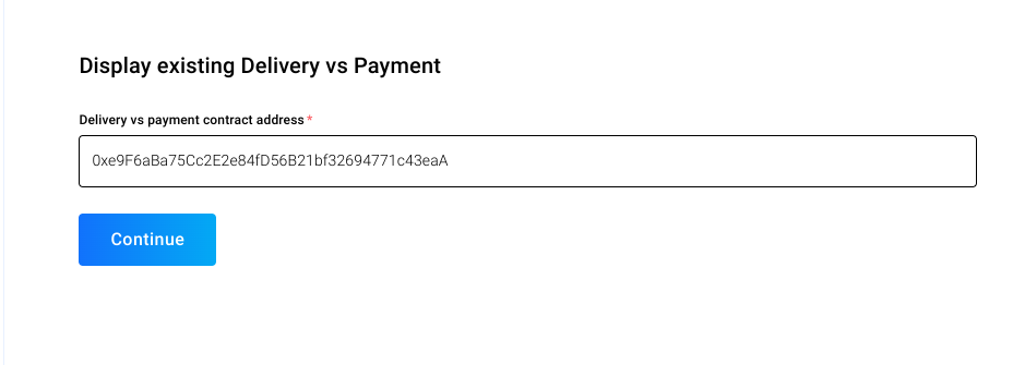 To manage an existing DvP contract, simply go to the Delivery vs Payment page on Token Tool and paste the DvP contract address under the "Display existing Delivery vs Payment" section.