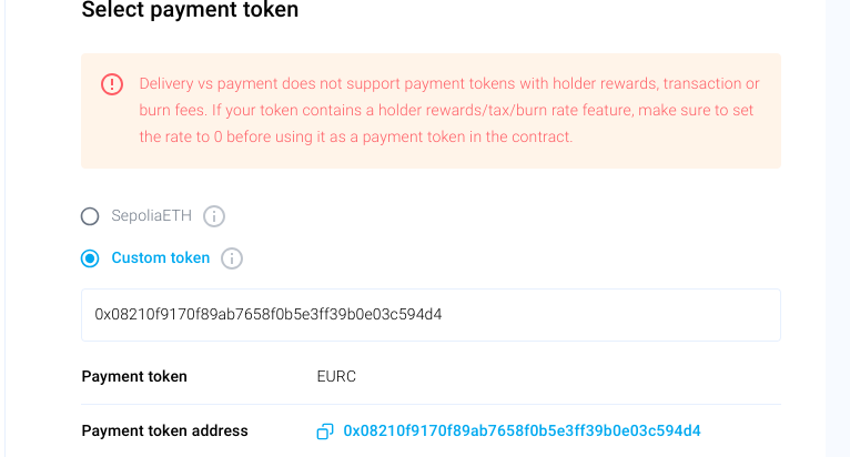 * Choose the payment token from the available options or enter a custom token address. Ensure that the token does not have holder rewards, transaction fees, or burn fees to be compatible with the DvP settlement function. If these features are available, make sure you set the rate to 0 before creating the DvP contract.