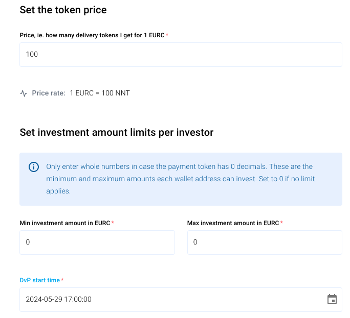 * Define the minimum and maximum investment amounts in the payment token (e.g., EURC). If no limits are required, set the value to 0.