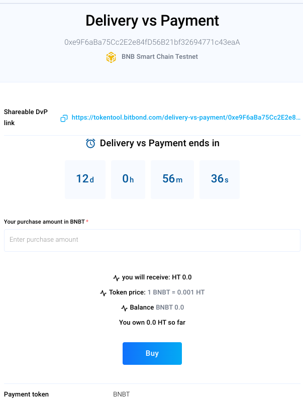 After that, click "Continue" and you will be redirected to the Delivery vs Payment page. This page serves as the DvP contract management section for the DvP contract owner (i.e. the seller), and as the buyer interface through which the token can be bought via the DvP contract:
