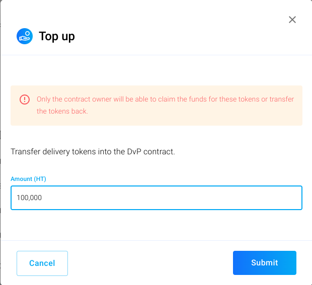 In order for the buyer to be able to buy tokens, the DvP contract must first be topped up with the desired token amount. To do so, scroll down to the "Manage DvP" section and click the "Top up" button: