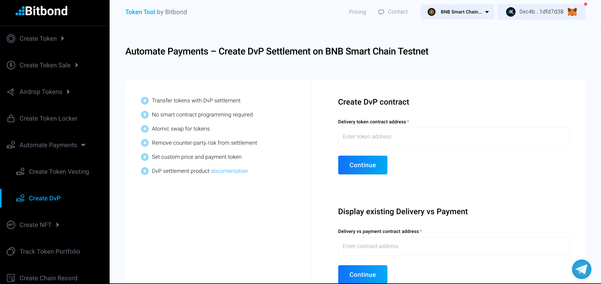* Click on the "Create delivery vs payment" button to finalize and create the DvP contract.