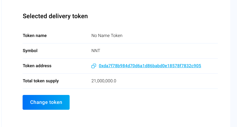 * Choose the delivery token (the token that is being sold to a buyer) via the drop-down or by pasting the smart contract address. Then click continue.