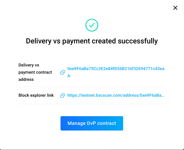 Once the DvP contract has been created and the transaction is processed, you will receive a pop-up modal displaying the **DvP contract address** and the blockexplorer link of the transaction. **Make sure to save the DvP contract address as you will need to be able to manage the DvP contract**: