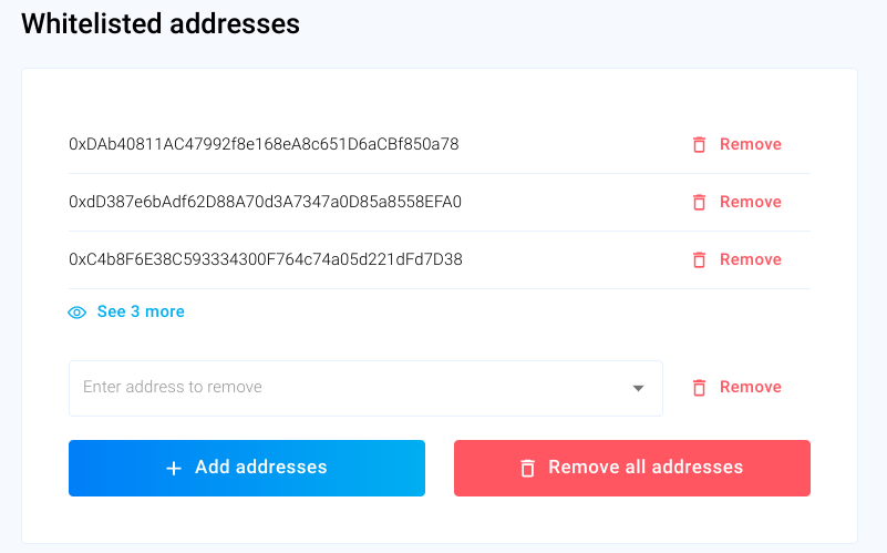If you activated the minter whitelist at the time of NFT creation, you need to add addresses to the whitelist. You can add them one by one in the input field or upload an entire CSV file. You can also remove address from the whitelist again.