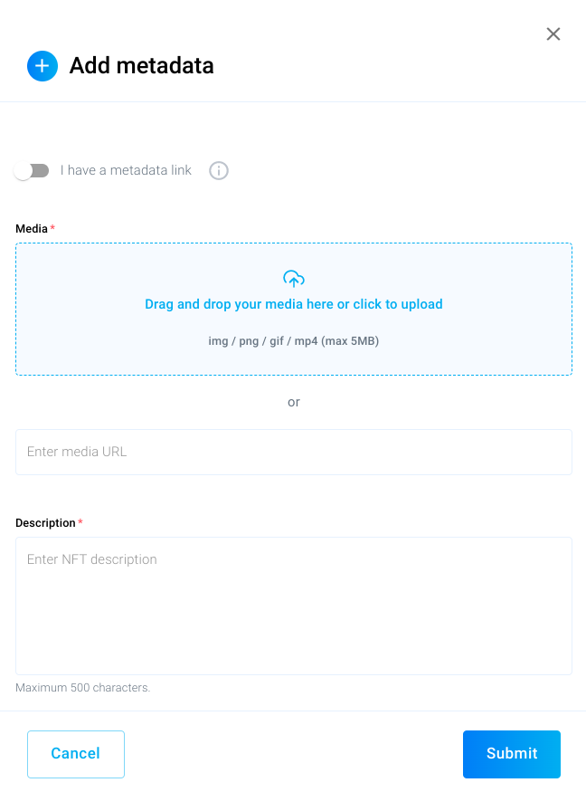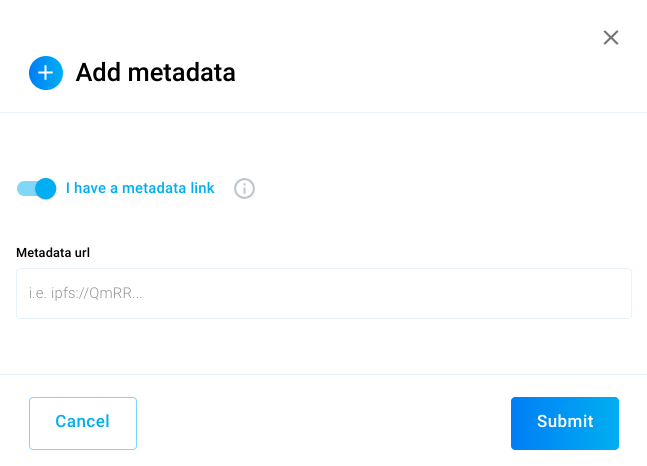 Instead of uploading the media files (images, videos etc.) via Token Tool you can also insert a link to your metadata that you uploaded to IPFS previously. For this you need to enable the I have a metadata link toggle: