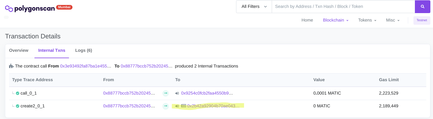 You will need to paste the NFT contract address into the field. If you haven't copied it from the success modal after you created the NFT (see Create NFT), you can look it up under your wallet address in a block explorer. You will see a recent "Deploy contract" transaction.