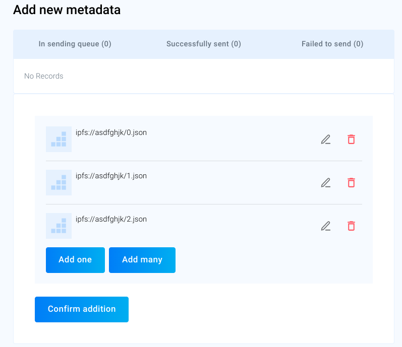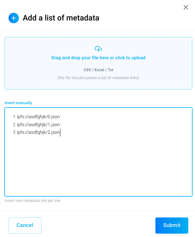 You can also add and mint NFTs as you go. This means you can add one metadata link and then already go ahead and mint the NFT. After that you could add one more metadata link and then mint this NFT and so on. You are not required to add all metadata links for your entire collection at once.