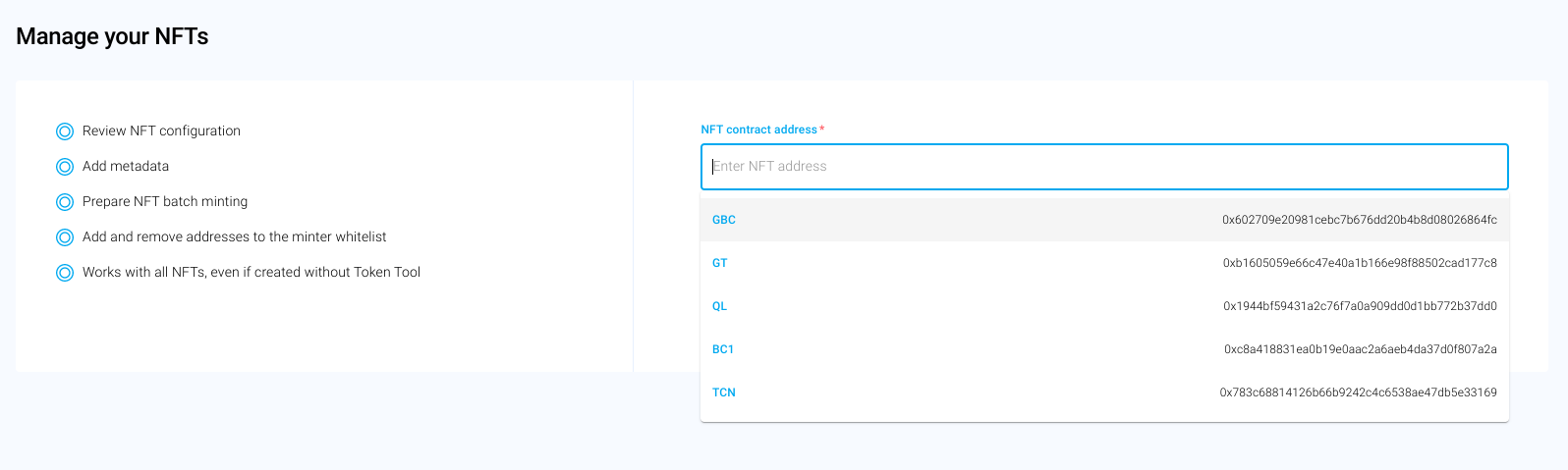 When you click the input field under Manage NFT, you will see a list of NFTs in your wallet. You can click the one you would like to manage. Note that after you create a new NFT and haven't minted any tokens of it, the NFT will not appear in the drop-down list, yet.