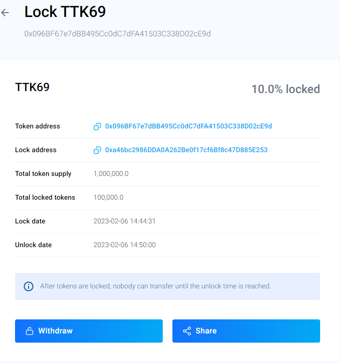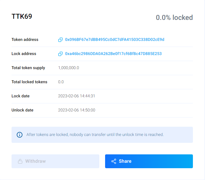 **Bookmark or save the Lock address**. This is important so that you can withdraw your tokens after the locker expired. One way to find the lock address in case you forgot to save it is to look at the holders of the token in a block explorer. You can usually identify the lock contract by the number of tokens or the date they were transferred.