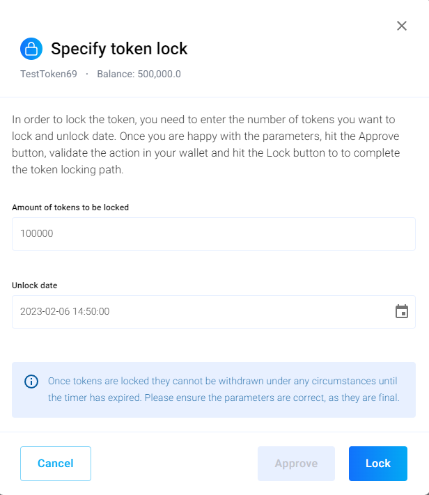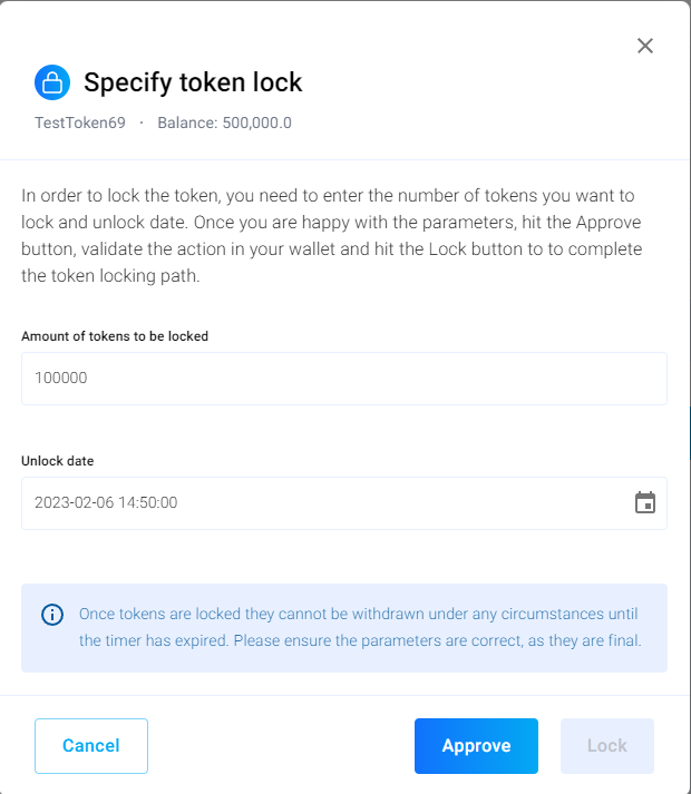 After you gave approval, confirm by clicking "Lock". This is your **last opportunity to check if you set the right parameters**. Do this carefully, as you will not be able to withdraw tokens from the locker until its expiry!