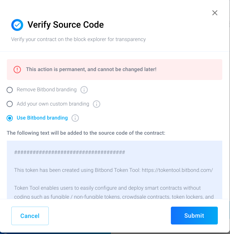 To verify the source code of the token locker contract, simply click on the "Verify Source Code" button. Similarly to token contract verification under [Manage Token](https://docs.bitbond.com/asset-tokenization-suite/token-tool/manage-token#token-verification), follow the steps be choosing the paid options such as removing Bitbond branding or add your own custom branding in the code, and the free version by keeping Bitbond branding in the smart contract code.